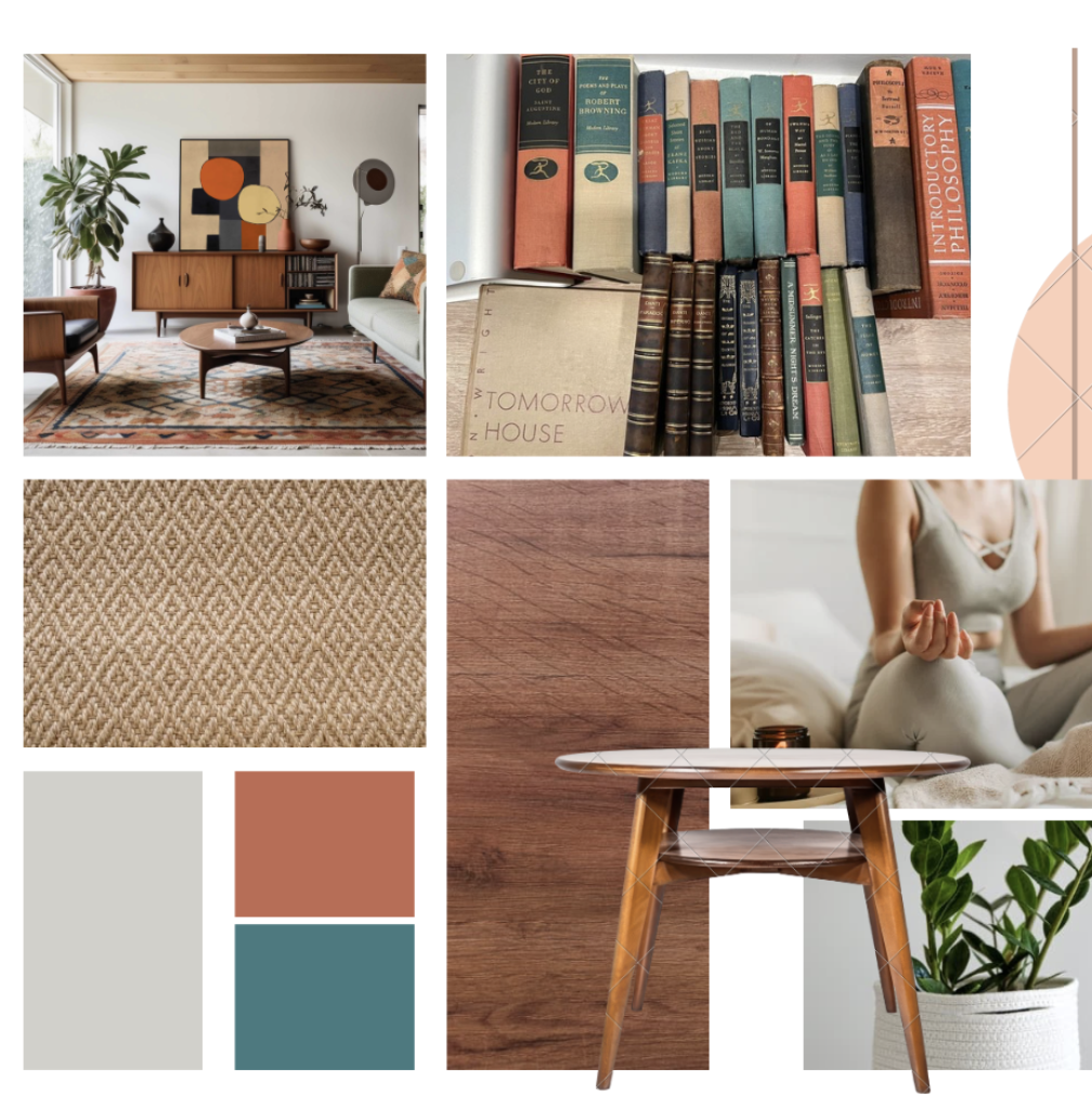 Our Client is currently on the Plus Package to transform their living room into an inviting space for relaxation and socialising. With a preference for warm neutrals and rich jewel tones, they love mid-century modern and industrial chic styles. Inspired by their hobbies and a collection of rare historical novels, we’re crafting a cosy, comfortable space with natural textures and ample seating